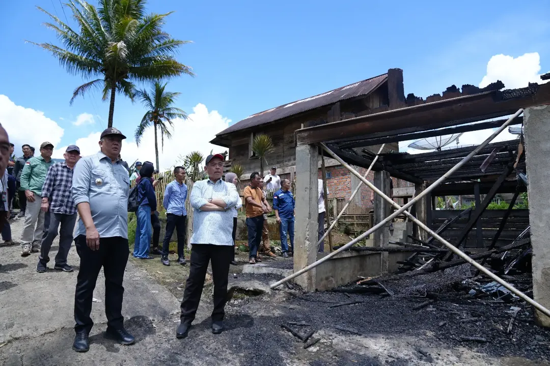 Bupati Lahat, Bursah Zarnubi, bersama Wakil Bupati Lahat, Widia Ningsih, S.H., M.H., didampingi sejumlah Organisasi Perangkat Daerah (OPD), meninjau langsung lokasi kebakaran rumah di Desa Sadan, Kecamatan Jarai, Kabupaten Lahat, Minggu (15/03/2026).